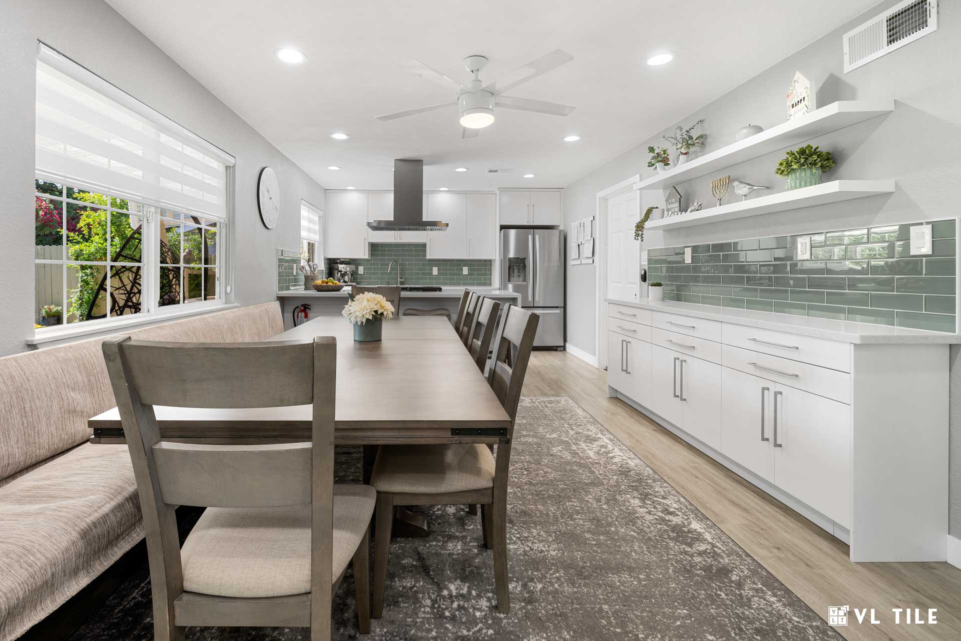 We install beautiful, natural looking, waterproof LVP flooring on all of the kitchen floor. The cabinets were delivered, put together, installed them very quickly making sure that everything has the right support for durability. Countertops with waterfalls on all edges are sucure with glue on top. After came the sinks and appliances which were fairly easy to install. Finally came the time for the beautiful sage green glass tiled backsplash. After backsplash tile installation the homeowners couldn’t wait to use their new kitchen. The Roseville complete kitchen remodel was finally complete. After all the last details were finished like cabinet handles, baseboards, light switches, electrical outlets, and floating shelves. Upon completion the homeowners were filled with tears of joy with the final product. We had finished another super-satisfied client and the complete kitchen remodel greatly exceeded all expectations! See more recent projects here https://vltile.com/recent-projects/.
